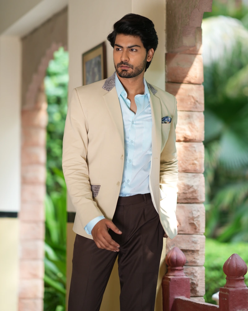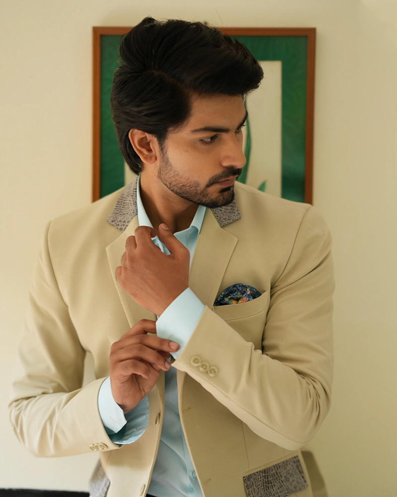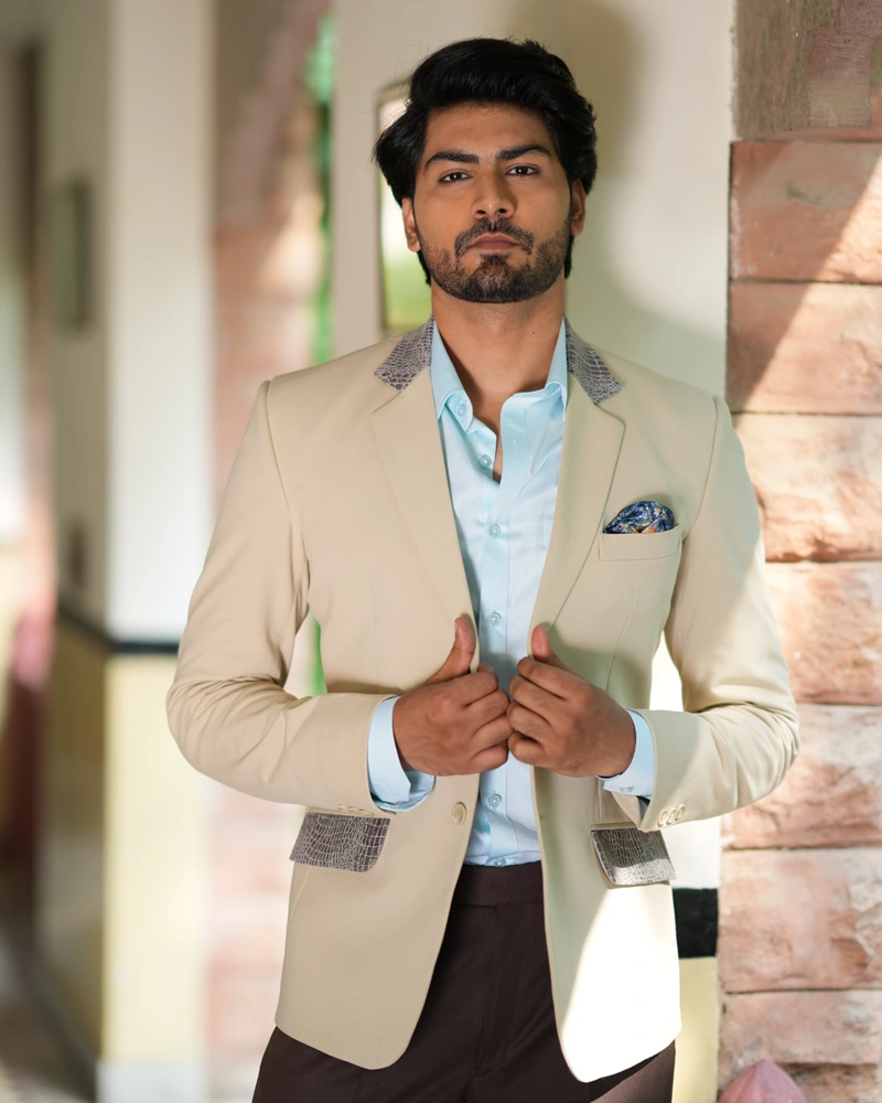 Hoisery semi fitted blazer with snake print detailing in upper notch collar and flaps of the pockets.
