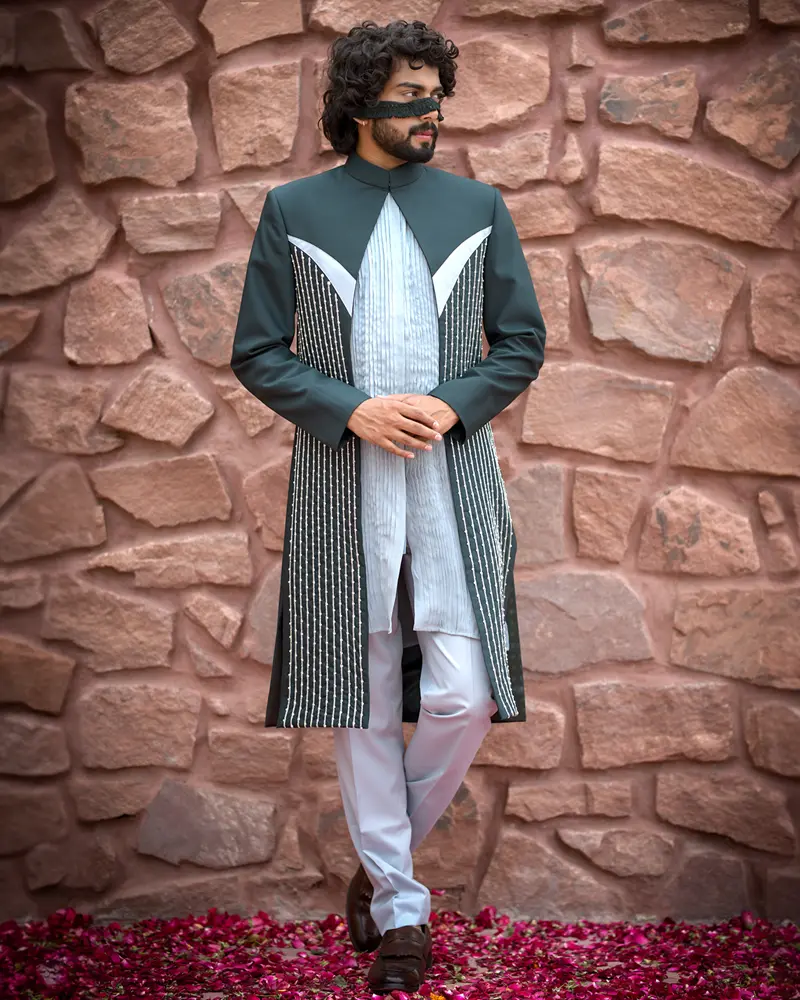 Step Into the Rhythm Rendezvous, Featuring A Polyviscose Kurta with Crepe Detailing and A Jacket in Baby Blue and Sacramento Green. The Pintucked Kurta Is Hand-Embroidered with Bugle Beads and Pearls, Creating A Harmonious Ensemble for Ethnic Occasions.