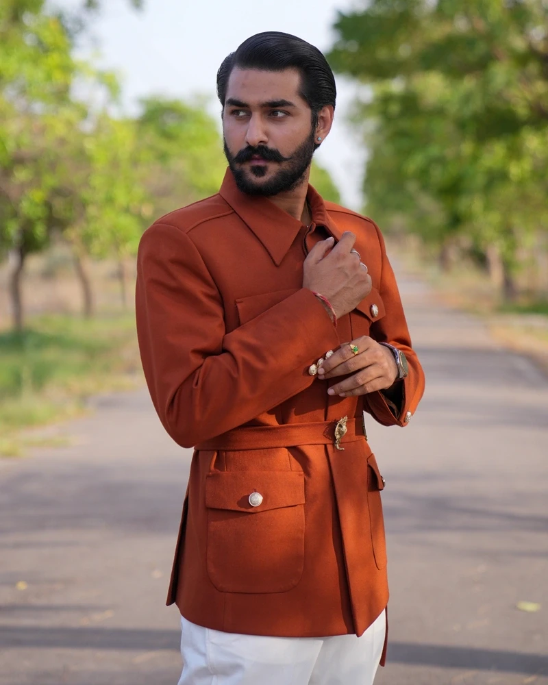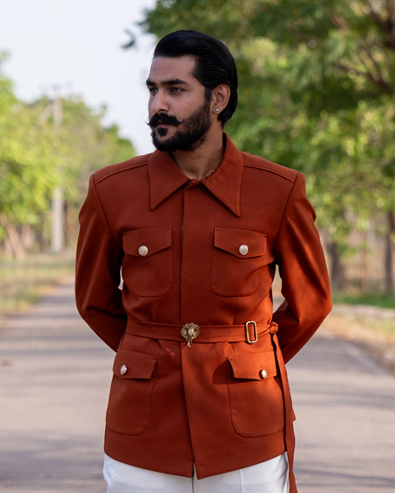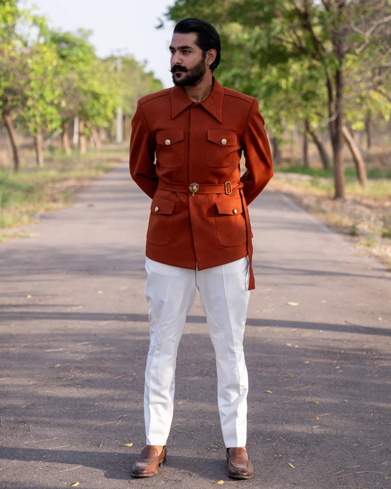 In the wilds of fashion, this tawny hosiery hunter coat adorned with an elephant brooch will make you feel like the guardian of the jungle.