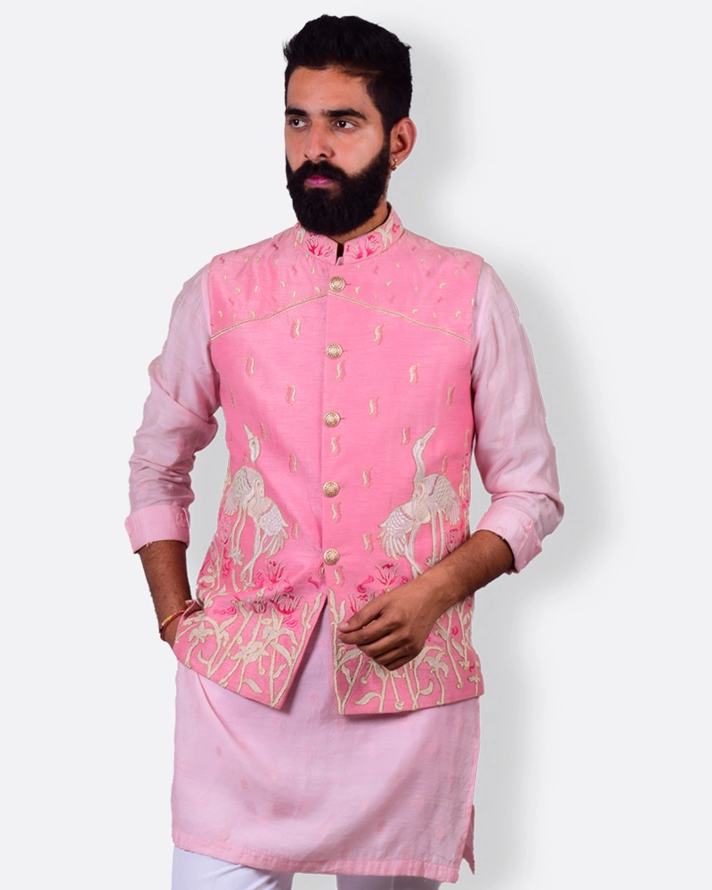 Sea Threads Features Intricate Machine Thread Embroidery on Seashell Pink for The Kurta and Jellyfish Pink for The Jacket, Creating A Captivating Ensemble.