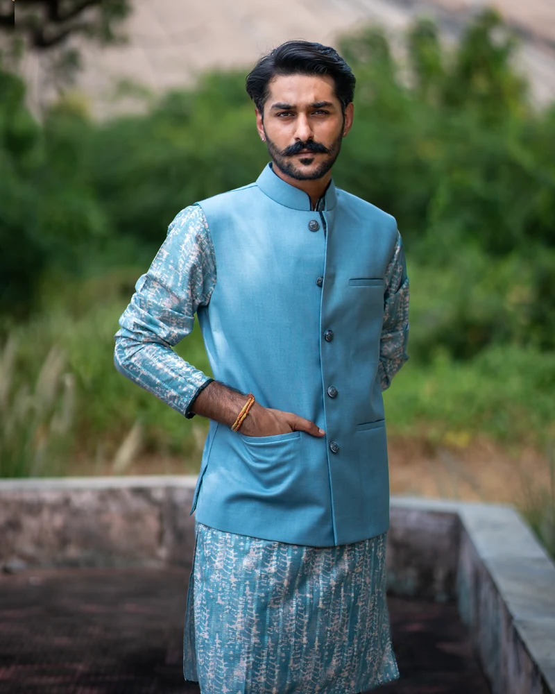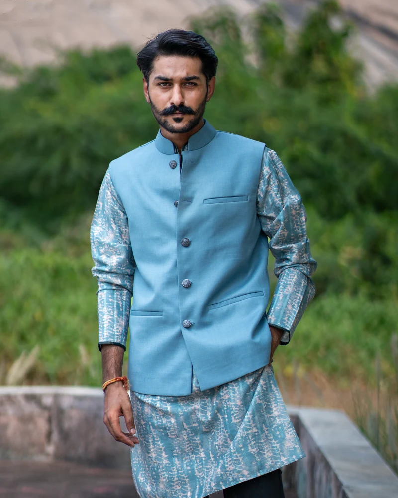Introducing the “Victorian Azure Charm Bundi, a minimalistic piece crafted from premium terry cotton for the lowkey Gentlemen. This exquisite Bundi is perfect for layering over kurtas and shirts, making it an ideal choice for any occasion?whether it?s a formal gathering or a family function. The soft powder blue hue adds a refreshing touch to your ensemble, ensuring you stand out with understated elegance. Embrace the seamless blend of comfort and sophistication with this timeless addition to your wardrobe, designed for the modern gentleman who values style and functionality.