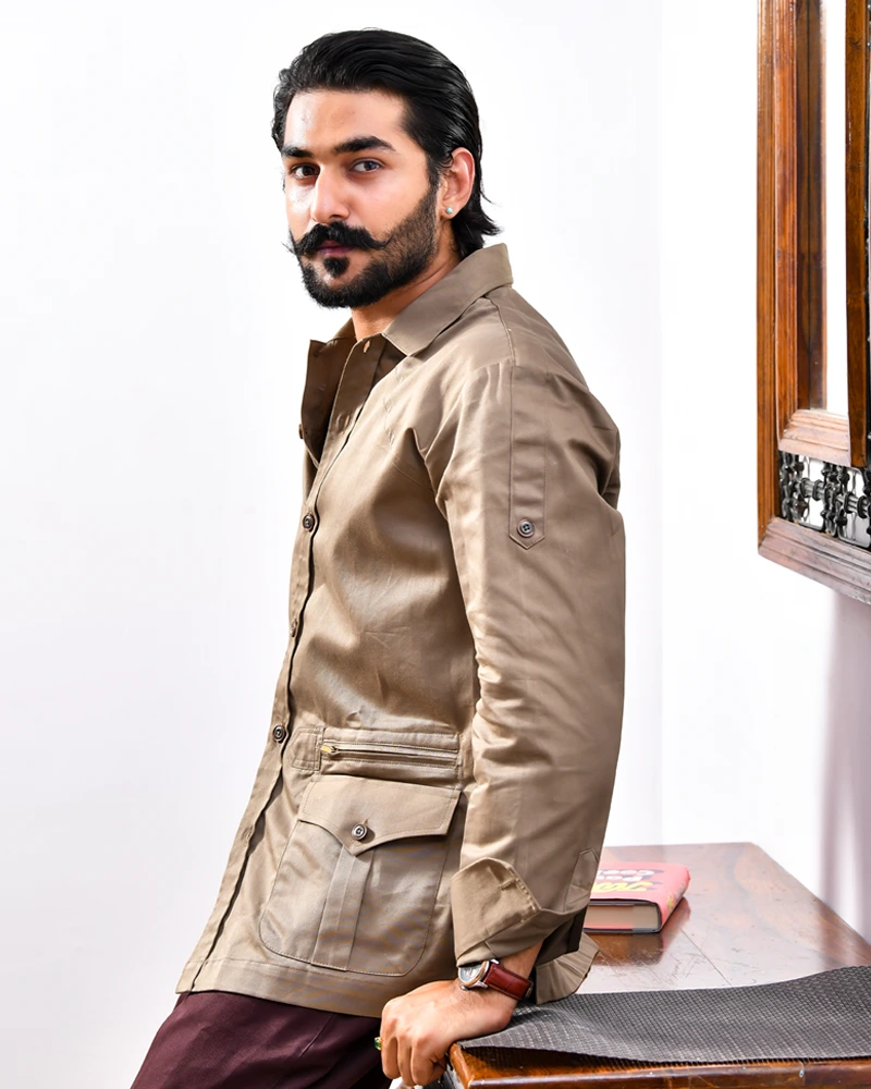 Step into the world of versatile style with this captivating shirt featured on our exclusive cover. Its rich tortilla brown canvas and the unique combination of box pleated patch pockets and sleek metal zippers create a fashion statement that’s impossible to ignore.