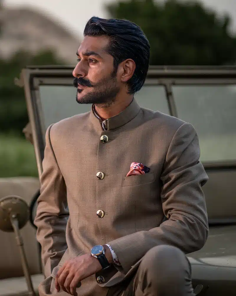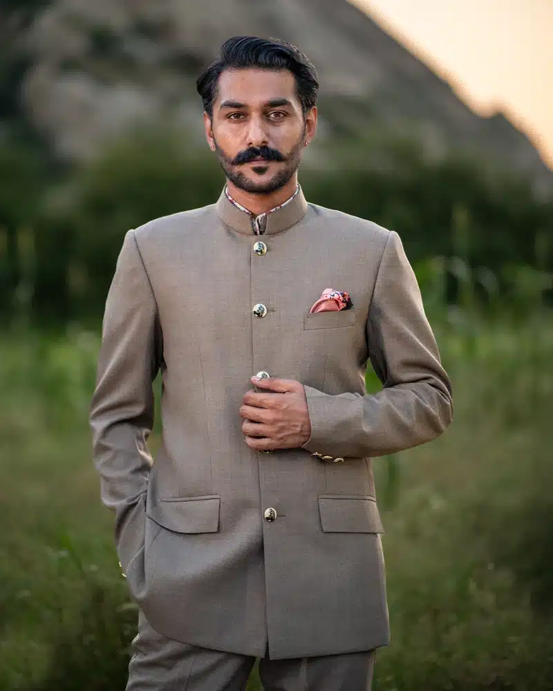 Testament of sheer sophistication, our “Classic Beige Grandeur Bandhgala” is a majestic monochromatic ensemble that exudes regal elegance. This masterpiece captures the understated allure of its soft beige hue, effortlessly blending refinement and luxury. The timeless charm of this Bandhgala makes it a symbol of nobility, ideal for any occasion where grace takes centre stage. Elevate your look with sleek, classic accessories for that final touch of opulence and poise. A perfect choice for those who value subtlety yet wish to make a statement of refined grandeur.
