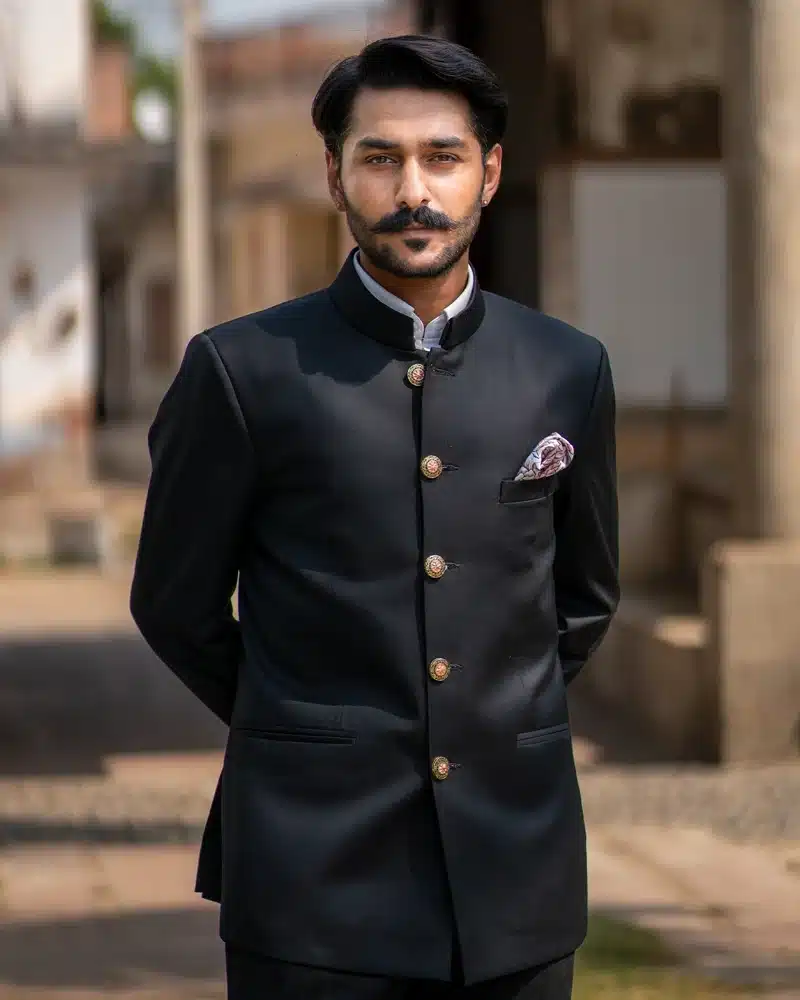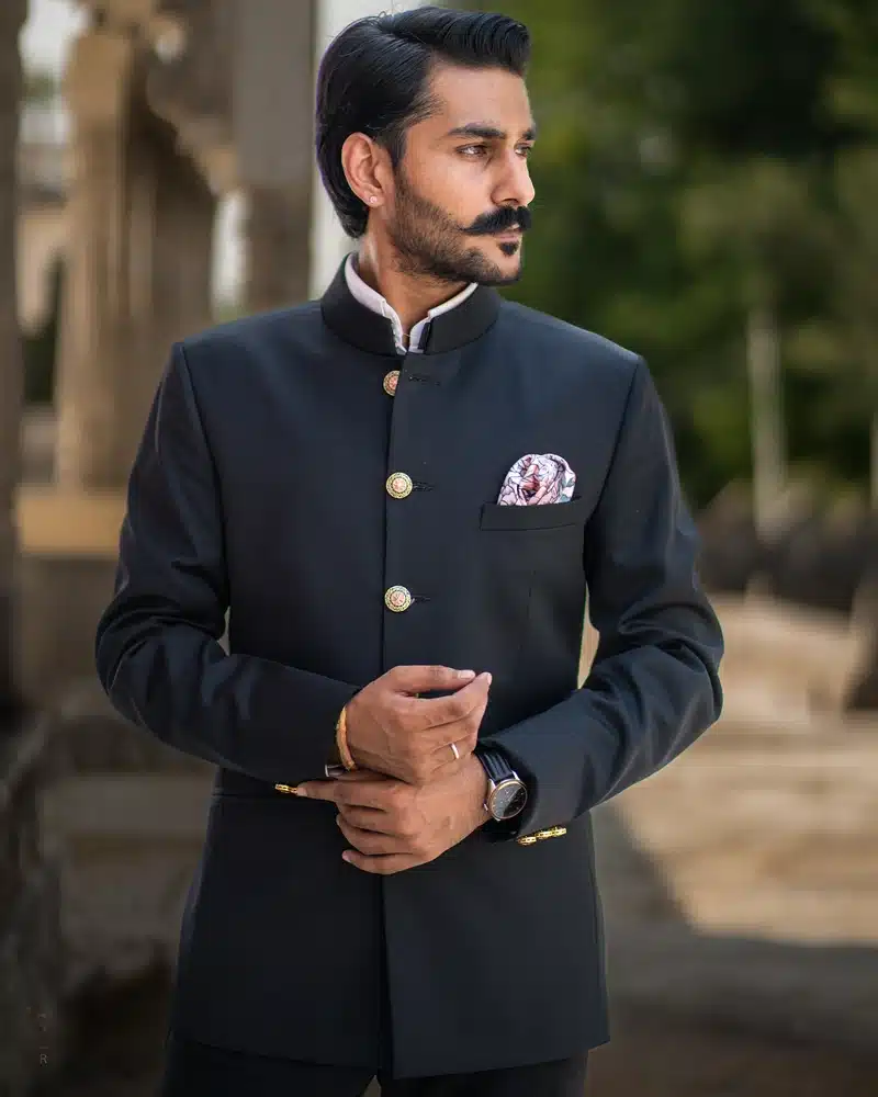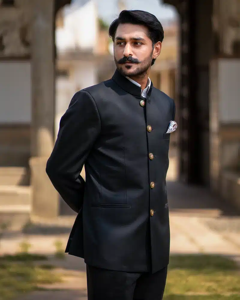 Experience the “Duke’s Obsidian Bandhgala”, emitting regal elegance with each stitch of this masterpiece. Tailored from luxurious superfine terry wool 130s, this Bandhgala offers an unparalleled sleek look. The fabric’s exceptional quality ensures a flawless drape that accentuates your silhouette with princely charm. To elevate the overall look, we introduced a cascade of golden buttons that pay homage to the legendary ‘dhals’ (shields) of Rajputana warriors.