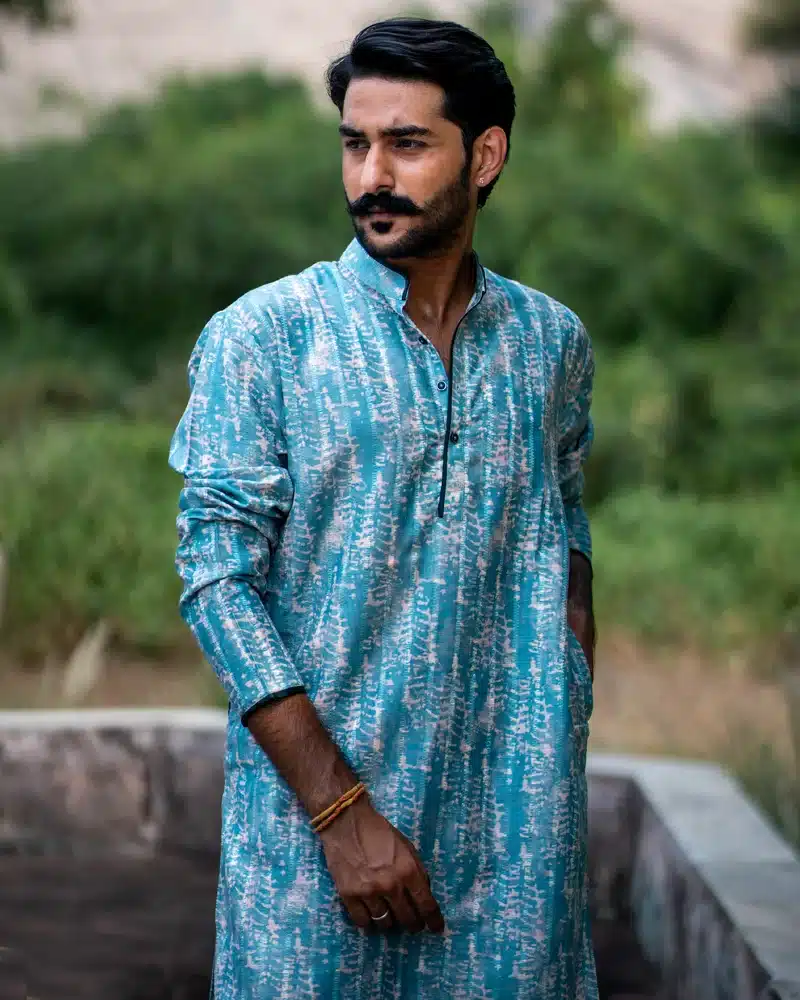 Presenting the “Elysian Aura Jade Kurta” from the “Timeless Tales of Dantiwara” collection—an epitome of ceremonial elegance crafted for the discerning gentleman. This kurta captures the essence of regal sophistication with its rich jade hue, a nod to timeless heritage and stately charm. The artful bandhani-style print weaves through the fabric, adding depth and visual intrigue, while each hue delicately forms patterns that exude a sense of refined grace.