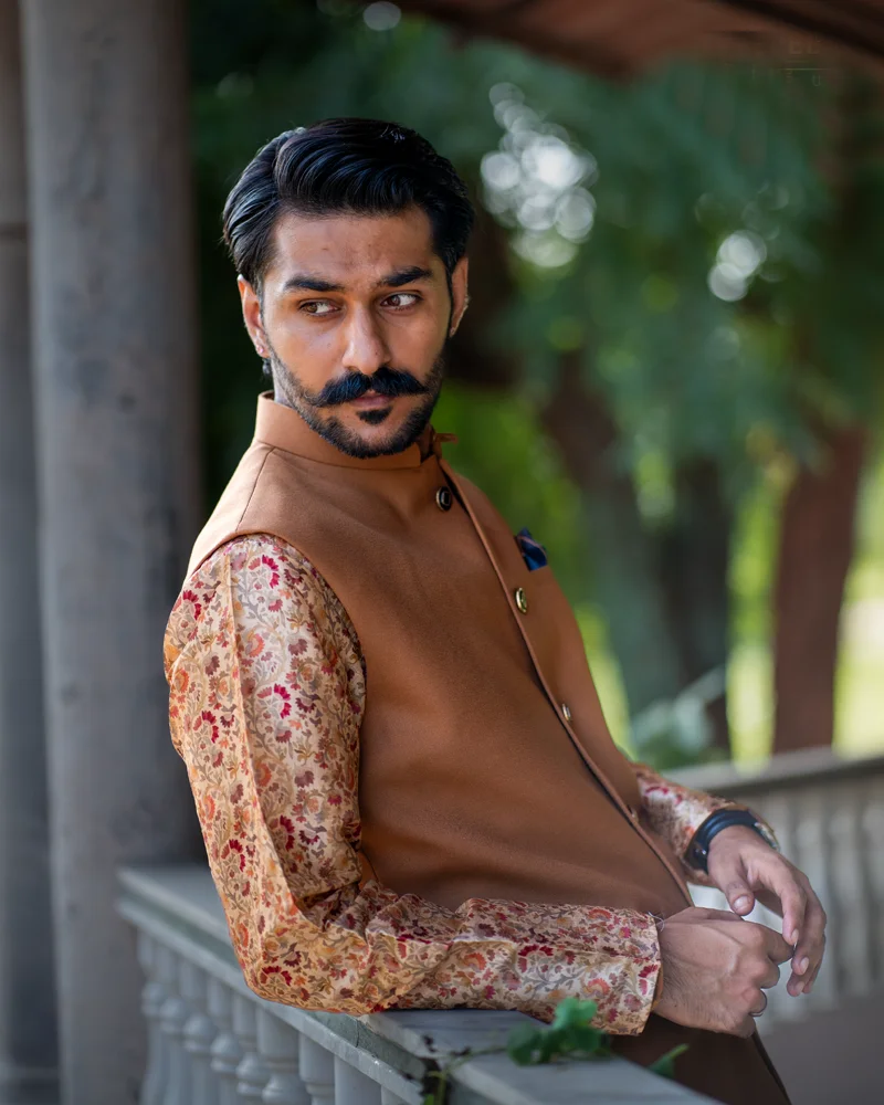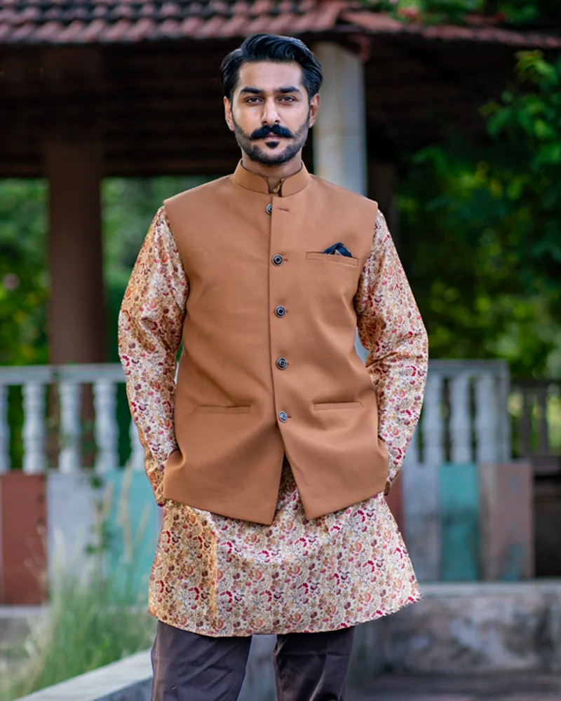 Ethnic wear reimagined with the “Fortified Legacy Tan Bundi”, a sophisticated piece featuring a classic Chinese collar. The versatile tan hue and minimalistic design make it perfect for both formal and informal gatherings, effortlessly transitioning from day to night. The Nehru Jacket’s striking contrast comes from the buttons, adorned with accents of black and gold, adding a touch of refinement to the overall look. Ideal for the modern gentleman, this Nehru Jacket blends tradition with contemporary flair, ensuring you make a lasting impression on any occasion.