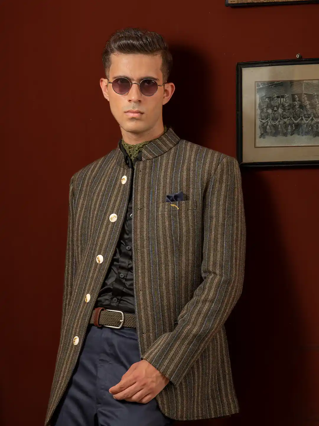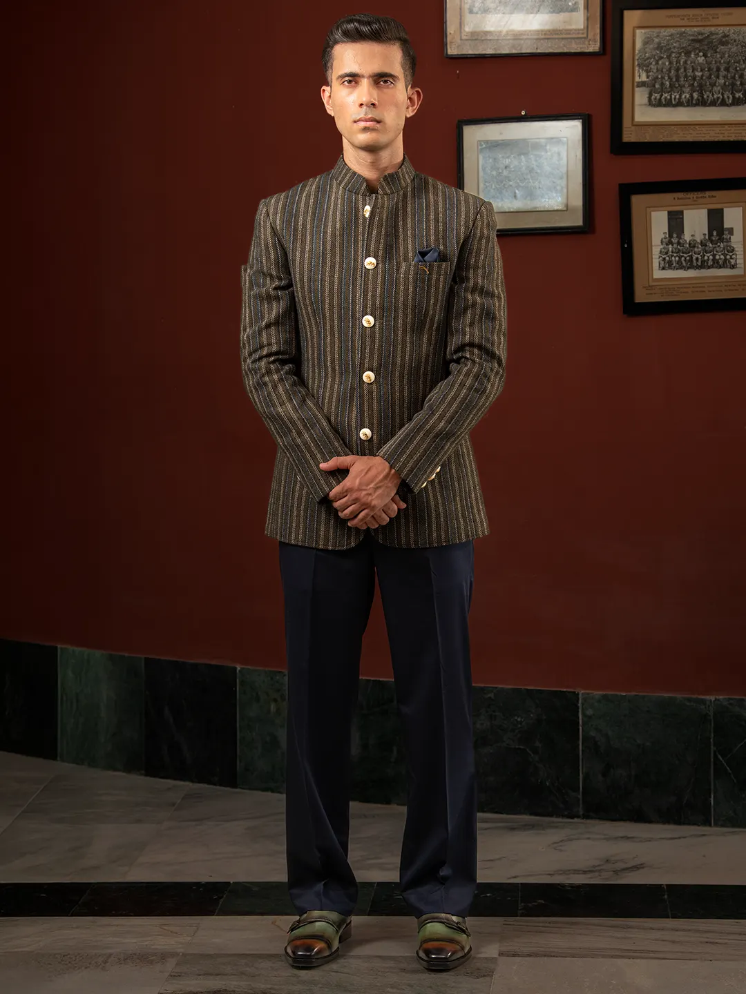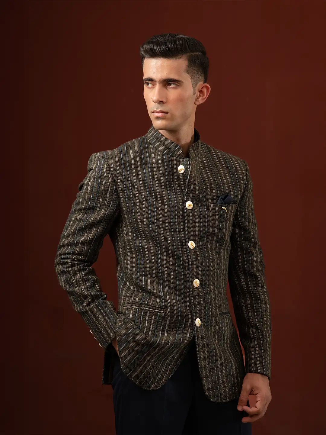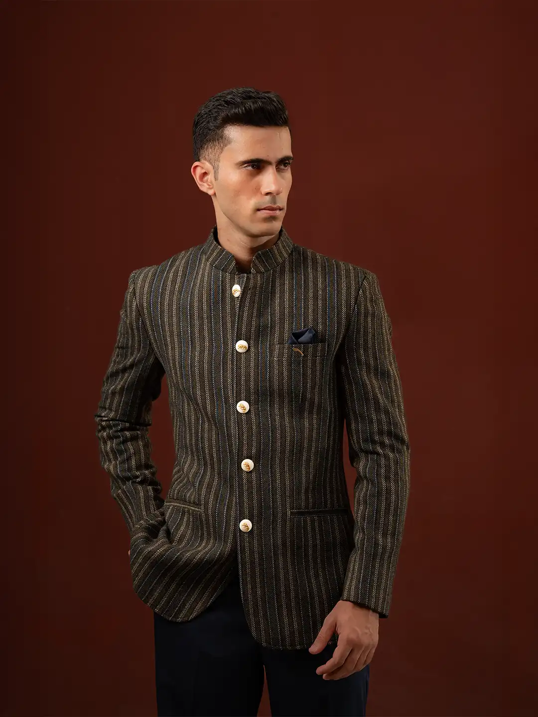 Command attention in the Khukri Crest Olive Tweed Bandhgala, a handcrafted masterpiece from Deepee’s luxury menswear collection. Inspired by the valor of the Indian military, this designer bandhgala for men combines timeless elegance with royal sophistication. Tailored in premium olive-green tweed with multi-colored pinstripes, it reflects discipline, pride, and understated power. The ensemble features a 92.5% pure silver brooch, polished silver-gold buttons, and a classic navy terry wool trouser, creating a regal yet contemporary look.