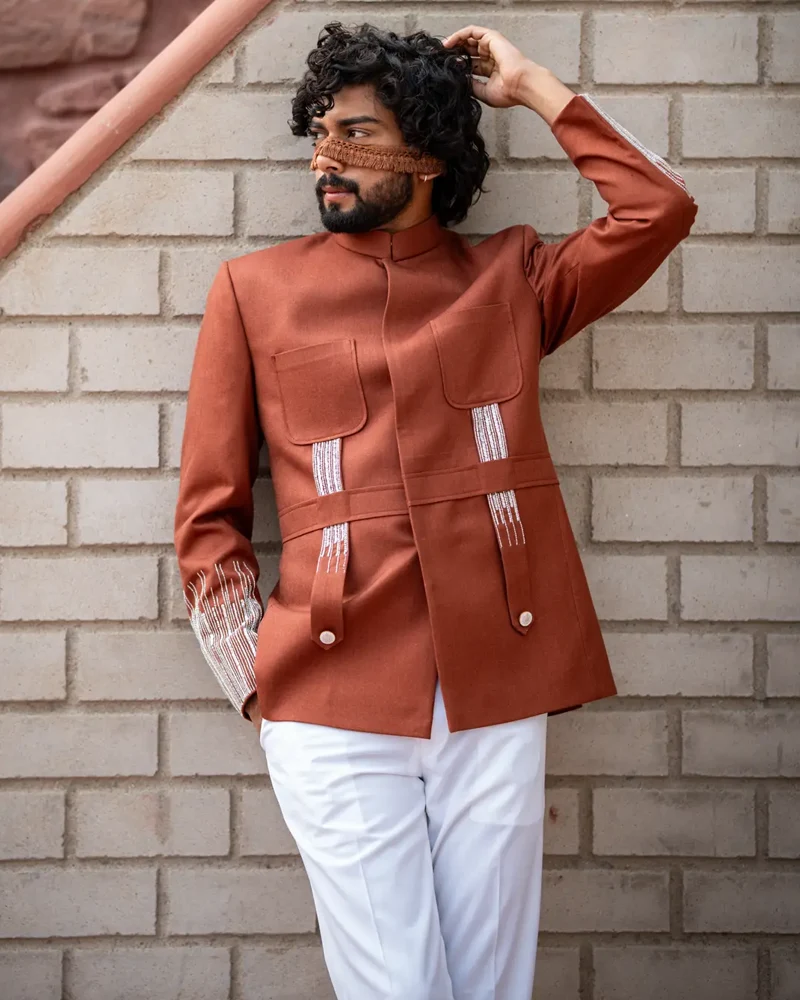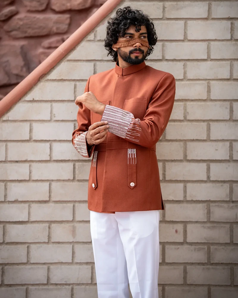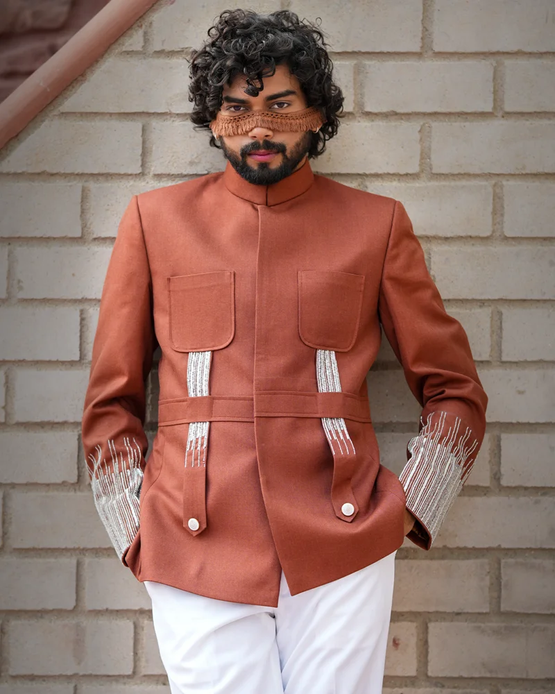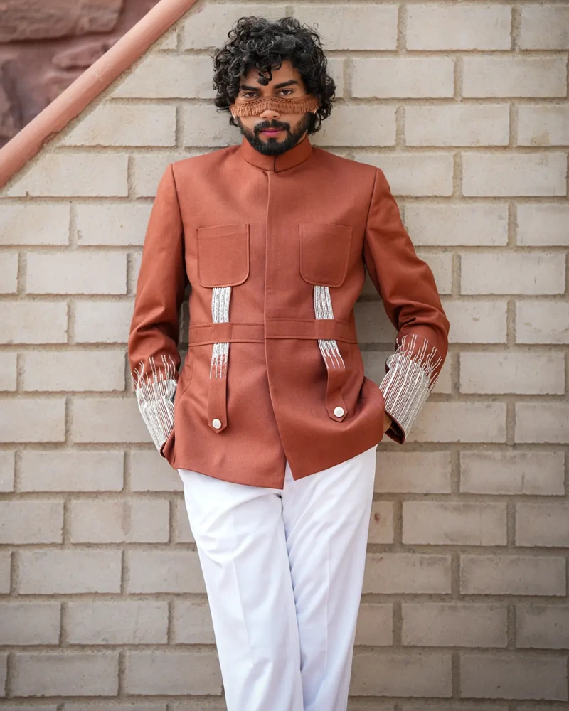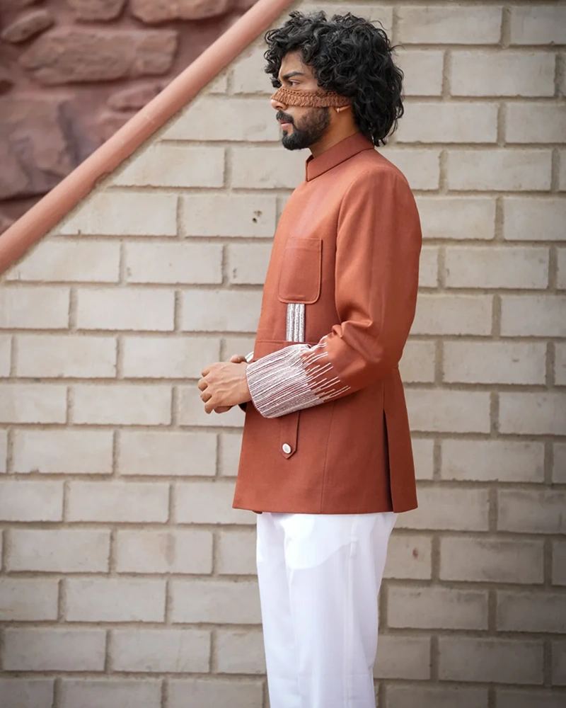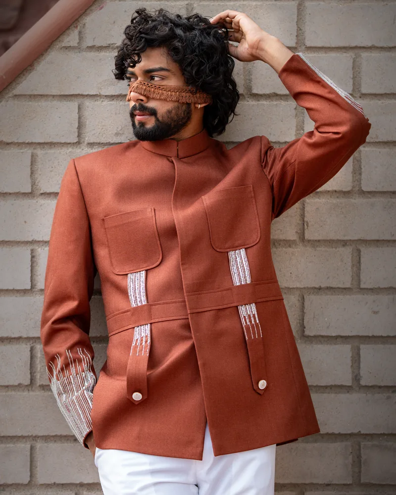 Make a statement with the Rajputana Rendezvous, a polyviscose and wool blend ensemble in a rich sienna hue. This signature hunting style outfit is meticulously hand-embroidered, ideal for ethnic occasions that demand sophistication and flair.