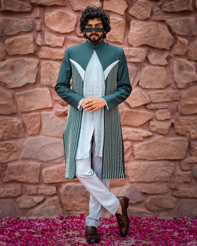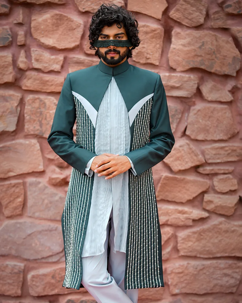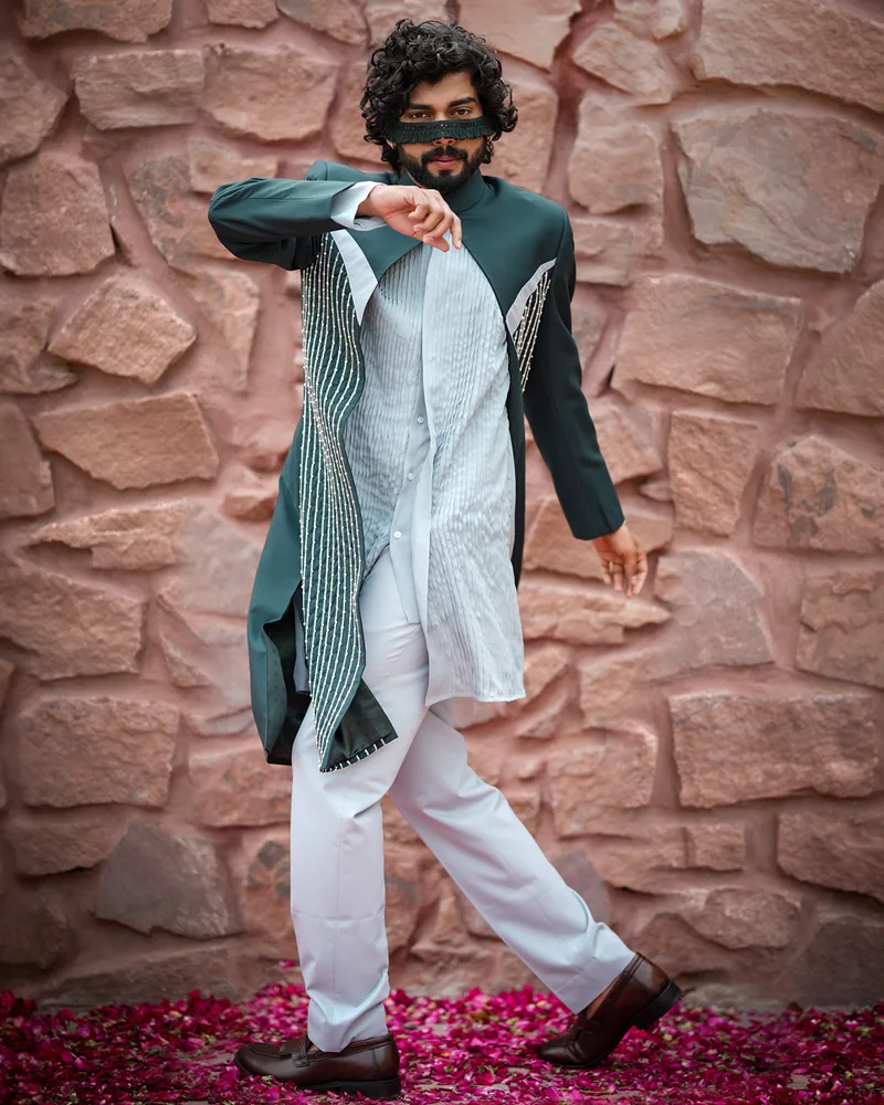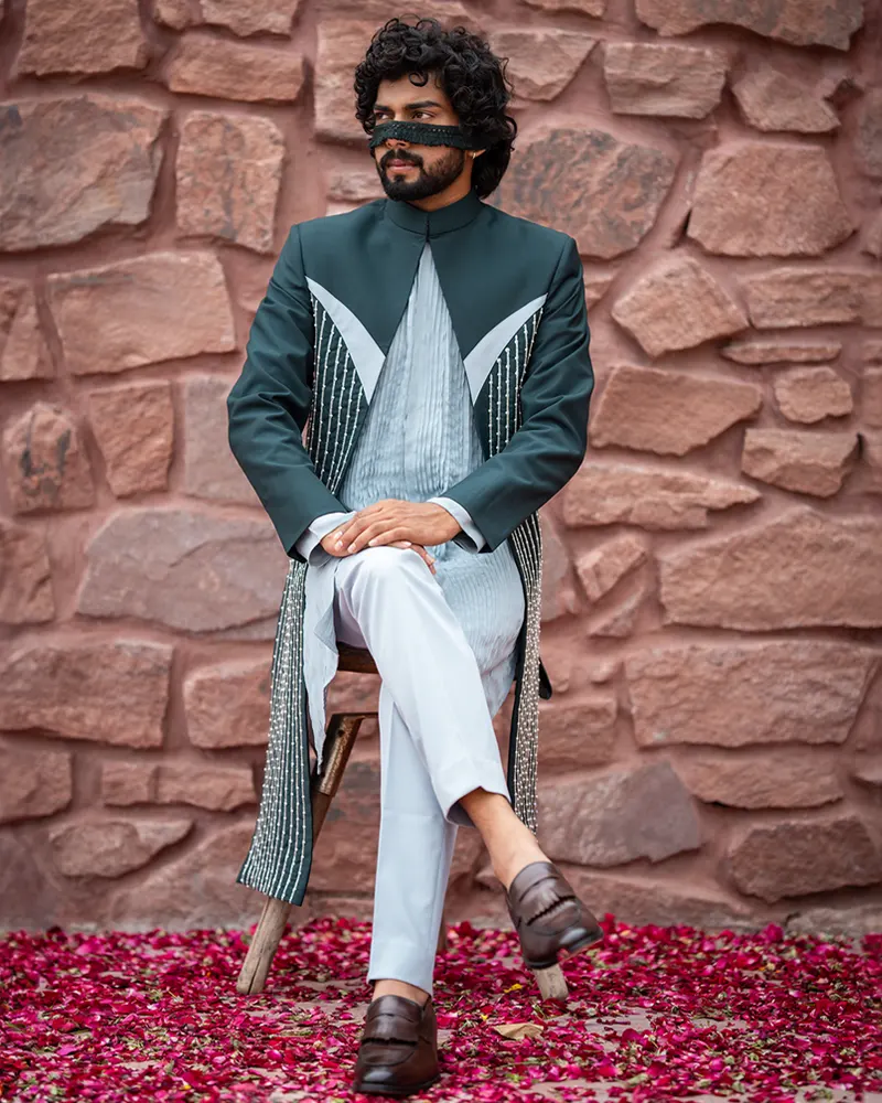 Step Into the Rhythm Rendezvous, Featuring A Polyviscose Kurta with Crepe Detailing and A Jacket in Baby Blue and Sacramento Green. The Pintucked Kurta Is Hand-Embroidered with Bugle Beads and Pearls, Creating A Harmonious Ensemble for Ethnic Occasions.