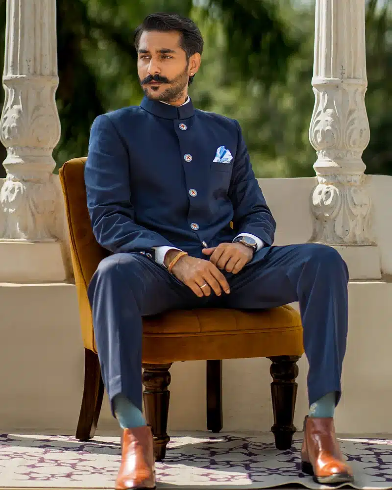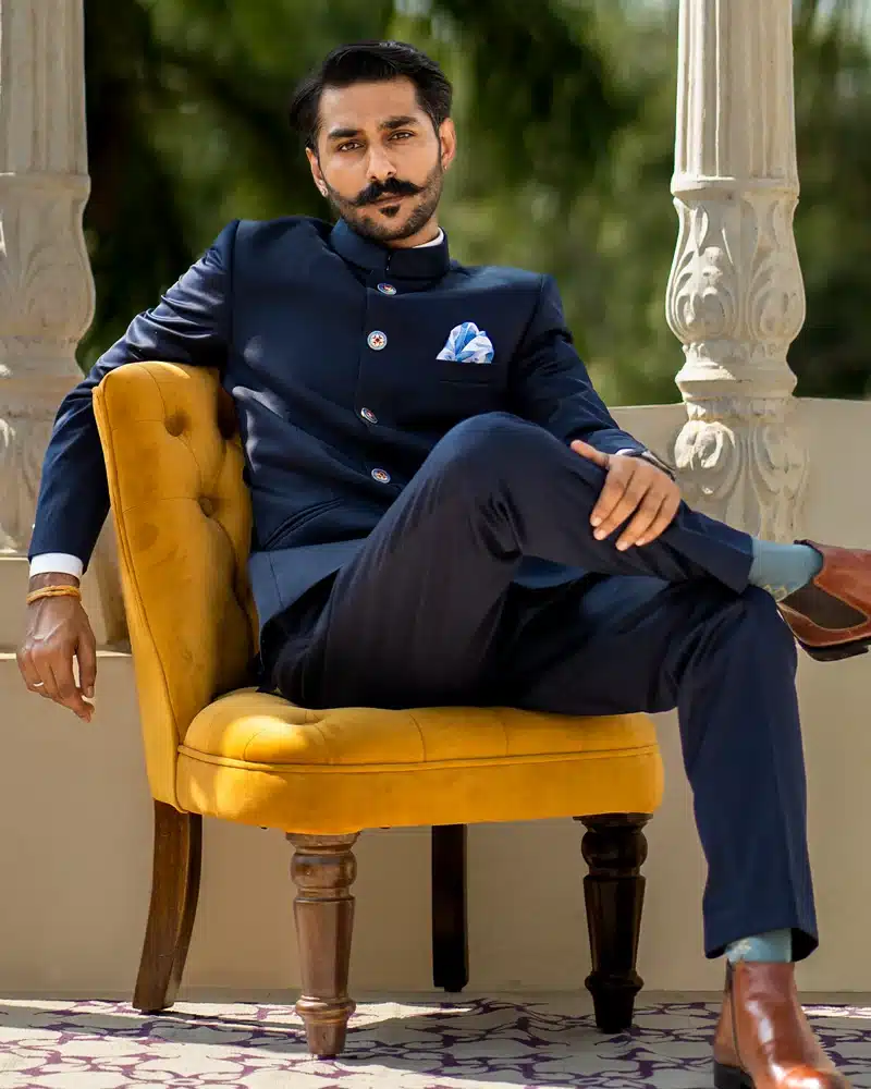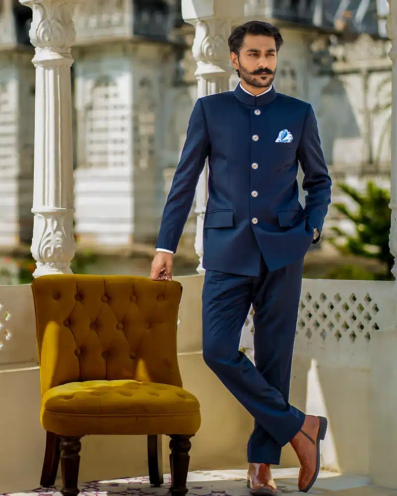 Command the room with the “Urbane Saphire Bandhgala”, a stunning creation in solid royal blue. Crafted from luxurious superfine terry wool 130s, this Bandhgala exudes confidence and an air of superiority. The regal hue embodies timeless elegance, making it the perfect choice for any event, whether formal or celebratory. Designed for the modern man with a princely flair, this outfit ensures you leave a lasting impression of refined sophistication and undeniable presence.